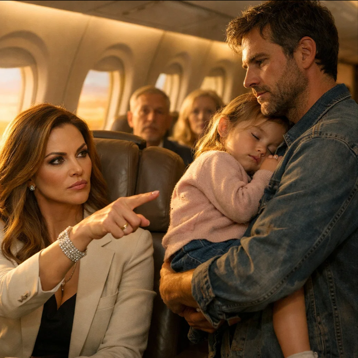 She pointed at him. Right there in the first class cabin 30,000 ft above the ground, Evelyn Hartley, worth $4 billion, turned in her leather seat, looked directly at a man in a faded denim jacket holding a sleeping 5-year-old girl against his chest and said loudly enough for the entire cabin to hear, “Excuse me, are you sure you’re in the right section?” The cabin went silent and Jack Callaway didn’t flinch.