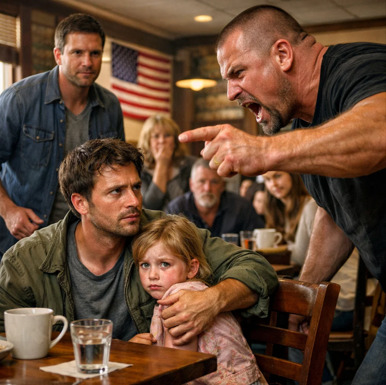 The cafe fell silent as the muscular man towered over the table, sneering at the tired father trying to calm his crying daughter. No one intervened. No one except the unassuming man in the corner who set down his coffee with deliberate calm. What happened next would change everyone’s perspective on judging others by appearance.