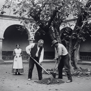 Doña Refugio estaba en el patio trasero regando las pocas plantas que aún mantenía con vida cuando escuchó un sonido extraño. Era un crujido como de madera vieja quebrándose. Levantó la vista y vio a don Aurelio y Tomás junto al muro del fondo del jardín, donde crecía una vieja higuera. Estaban cabando.