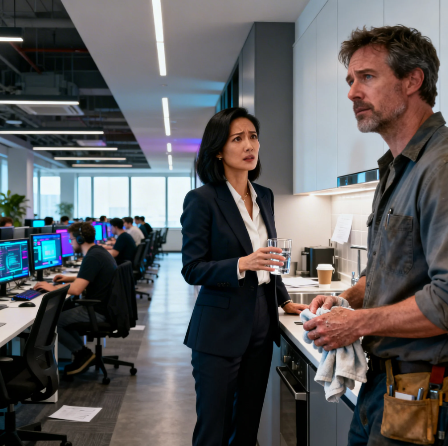 He heard every word Maya said. He stood up slowly, wiping his hands on a cloth, and Maya nearly dropped her glass when she realized someone was there. “I’m sorry,” she gasped. “I didn’t see you. pipe under the sink,” he said, simply pointing down. Then, after a pause that felt longer than it was, he added, “I’m I mean, I could help.