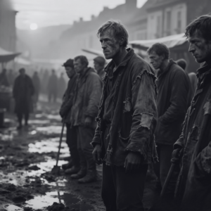 Hace apenas 4 años, la muerte negra arrasó estas calles como un ángel vengador invisible. Quizás la mitad de la población pereció en semanas de fiebre. Bubones hinchados y agonía. Los sobrevivientes ahora navegan una ciudad transformada, casas vacías marcadas con cruces rojas, calles enteras donde crece hierba entre las piedras, niños huérfanos mendigando en esquinas que antes conocían como hogares prósperos.