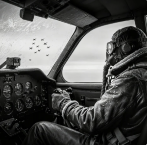 Su mano izquierda proporcionó la movimiento. Su muslo se convirtió en el ancla punto de apalancamiento. Fue crudo. fue desesperado. No debería haber funcionado. pero en esa cabina congelada, con hielo formándose en el interior de su dosel y su respiración entrecortada a través del máscara de oxígeno, funcionó. el palo respondió. El avión se ladeó.