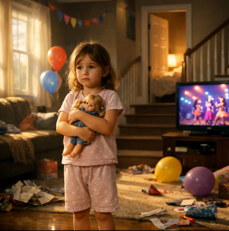 She goes downstairs to the living room, which is still messy from the previous day’s celebration. Upon arriving, Piju calls his dad, Gorab, to see if he is home, but no one answers. After walking around the room for a while, he approaches the front door and tries to open it, although he cannot reach the doorknob.