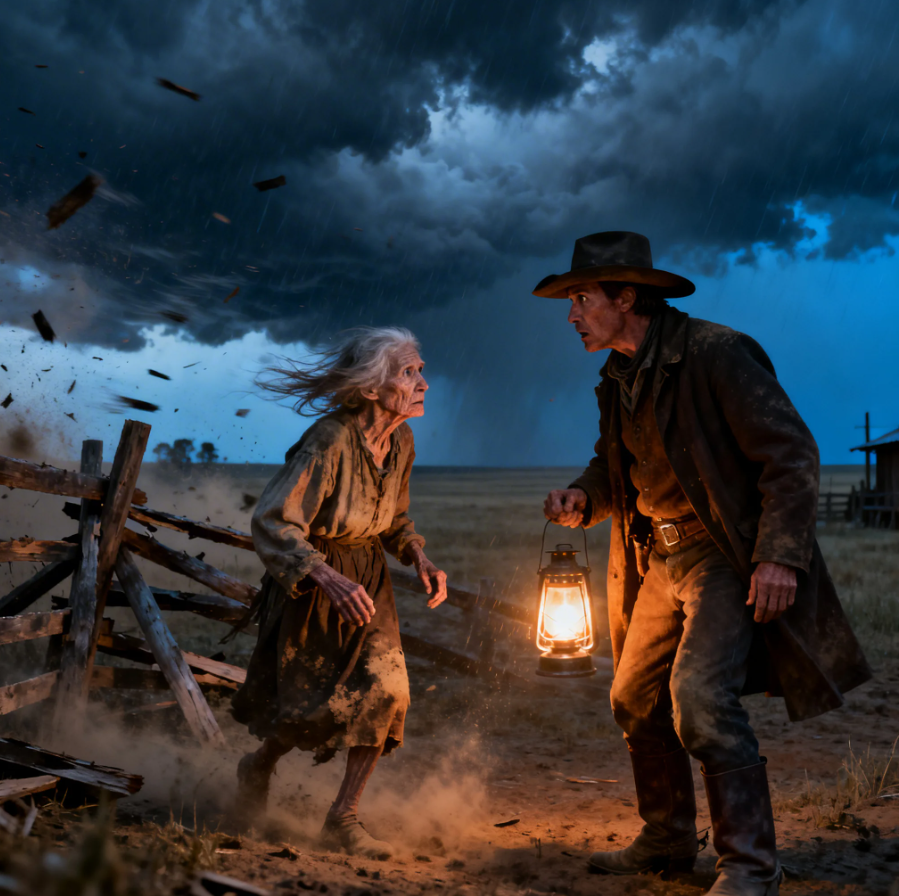 The wind howled across the empty plains that night, carrying secrets no one dared to whisper aloud. And just as the lantern flickered near the broken fence, the rancher saw something that made his heart stop cold in his chest. There, barely standing against the storm, was an old woman, her fragile frame trembling beneath worn out layers of dust covered clothing that looked like they had not known warmth in years.