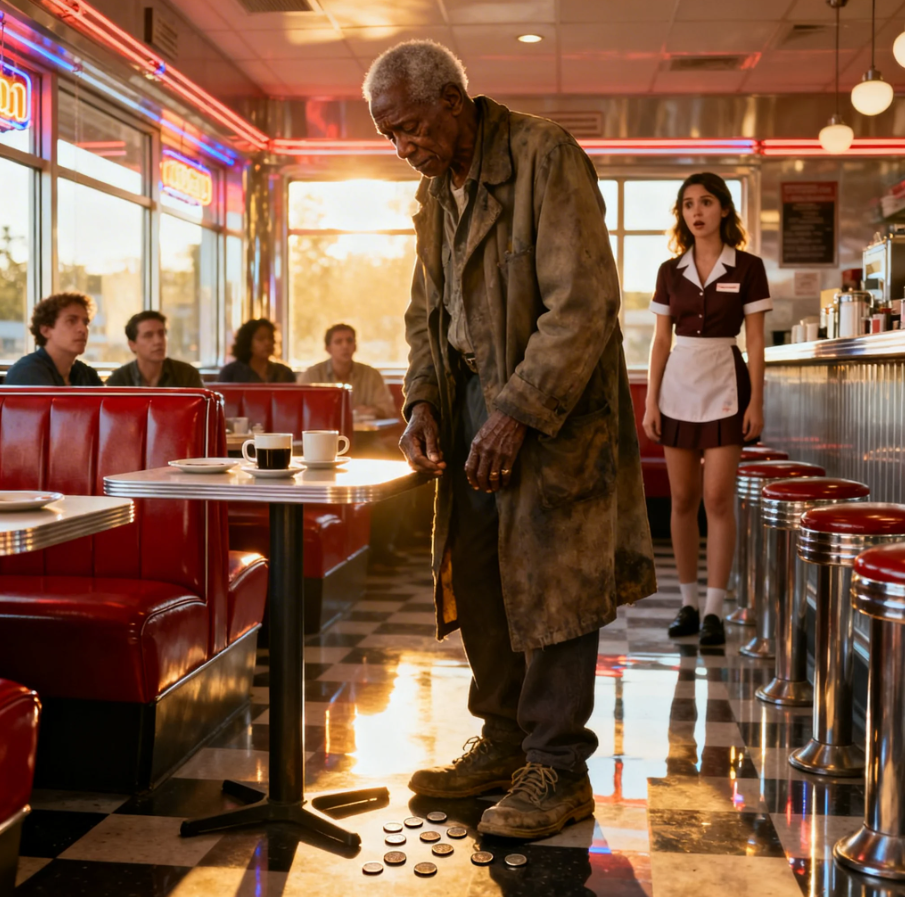 The coins didn’t just fall, they echoed. They hit the cold diner floor one by one, sharp metallic clinks that sliced through the chatter of customers and the hum of coffee machines like a quiet kind of thunder. Every head turned. Every fork paused mid-air. And in the center of it all stood an old man with trembling hands, his worn fingers still curled as if trying to hold on to dignity that had just slipped through them.