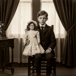 A primera vista, el La imagen parecía confirmar la etiqueta. el El chico estaba rígido, vestido de domingo. ropa, sosteniendo una muñeca que claramente era destinado a pertenecer a una hermana menor. el La composición era típica de la época. el centrado en el sujeto, el fondo plano, la expresión neutral como exige largos tiempos de exposición.
