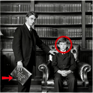 Estantes de madera oscura revestidos las paredes detrás de él, llenas de volúmenes coincidentes. A su izquierda había un joven de unos 20 años, vestido con la vestimenta discreta de un profesional educador, traje oscuro, montura metálica gafas. Una mano descansaba ligeramente sobre el hombro del niño. El otro sostenía un libro encuadernado en piel inclinado hacia abajo como aunque acababa de estar leyendo en voz alta.