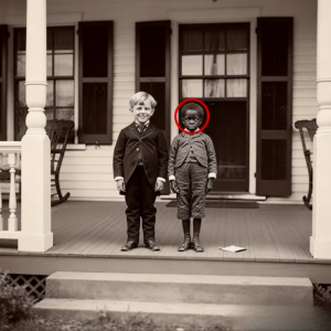 La imagen en tonos sepia fechada 1857 Mostraba a dos niños parados uno al lado del otro en el porche de una gran casa sureña. en un niño, rubio y sonriente en un traje caro, parecía tener alrededor de 8 años de edad. A su lado había otro niño de la misma edad, un niño negro vestido con ropa formal que colgaba holgadamente sobre su delgada figura.
