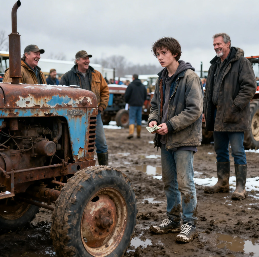 The wind cut across his face again. Sam turned back. His heart pounded as he raised his hand. 90 bucks. For a split second, the crowd went quiet. Then the laughter came. But Sam didn’t hear it this time because for the first time since walking out that door, he wasn’t drifting anymore. He had made a choice. By the time the tow truck dropped the tractor off at the edge of a public lot near the treeine, the sun was already sinking.