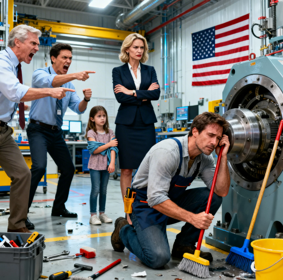 Marcus Cole dropped to his knees on the cold concrete floor and pressed his ear against the base of a machine worth more than his life. Every engineer in the room laughed. The CEO crossed her arms and sneered, “Get this janitor out of my facility.” But Marcus didn’t move. His 8-year-old daughter, Sophie, stood behind him, gripping his sleeve, whispering, “I hear it, too, Dad.