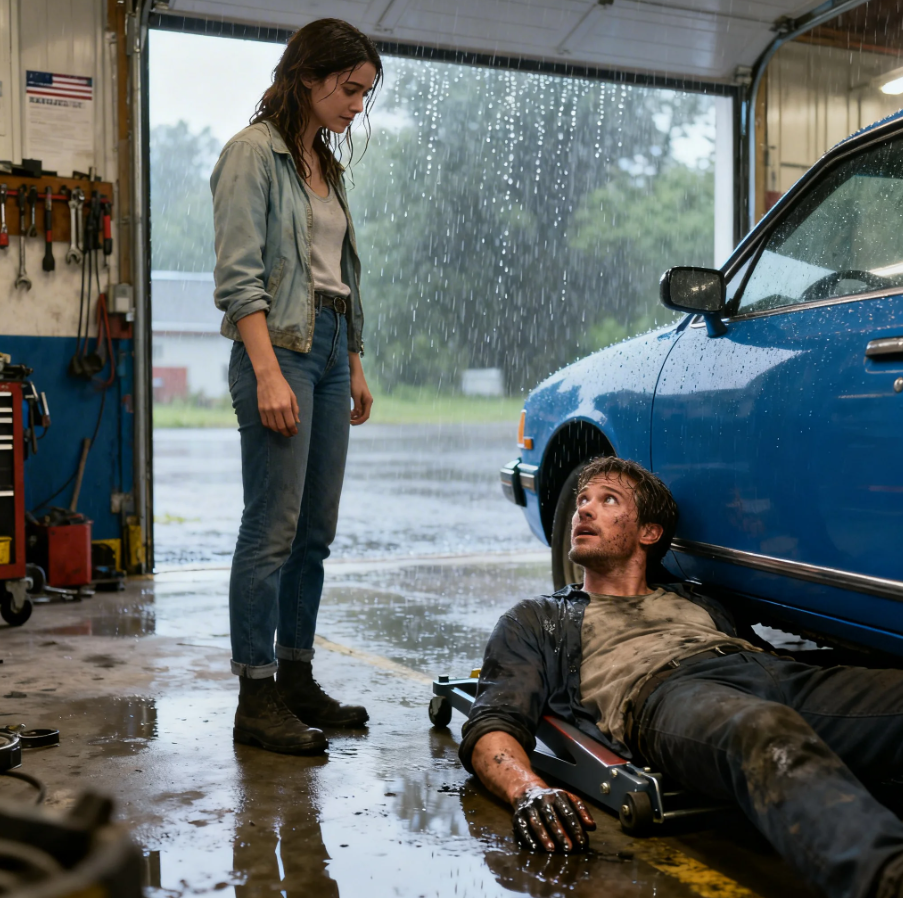 How’s it looking down there, Noah? Her voice was soft, almost drowned out by the rain and the occasional rumble of thunder that shook the windows of the old garage. Just a loose connection to your alternator. Nothing serious. I reached for my wrench, my fingers slipping slightly on the cold metal. The familiar scent of motor oil and the metallic tang of the undercarriage filled my nostrils as I worked.