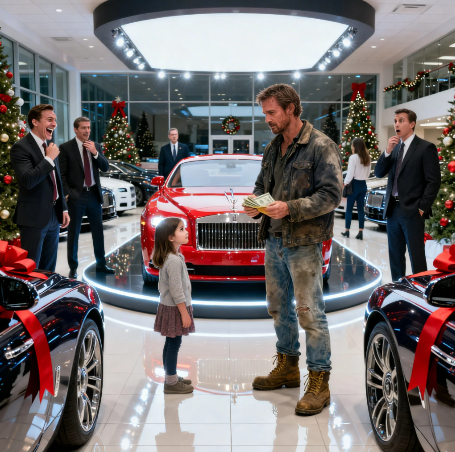 The laughter started low, just a few snickers behind, polished desks, but it grew louder, sharper, until it echoed across the showroom like something alive. Daniel froze near the entrance, one hand still resting on the glass door he had just pushed open. For a moment, he thought about turning around. He thought about pretending he had walked into the wrong place, about stepping back into the cold December air where no one would look at his worn boots or his threadbear jacket.