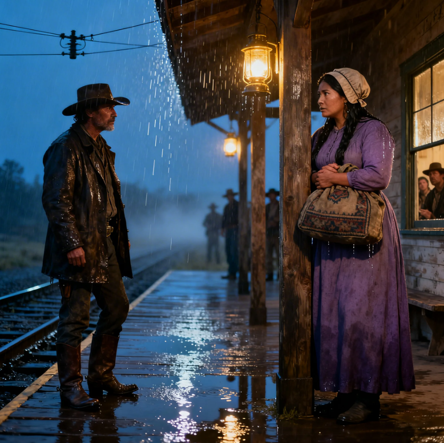 He looked at Maybelle, and in her tentative nod, he glimpsed the quiet courage it took to hope for something gentler than what she’d known. As the conductor called for boarding, Weston rose, offering her his hand. The lantern above them flickered, casting their shadows long across the rain-slicked planks.