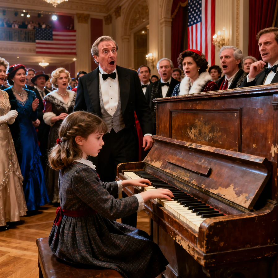 The first note trembled, not from the piano, but from her fingers. Everyone heard it, and everyone expected it to fall apart. The ballroom buzzed with laughter, clinking glasses, and the careless arrogance of people who had never been told no. Crystal chandeliers cast golden light over polished marble floors, reflecting wealth, so loud it drowned out everything else.