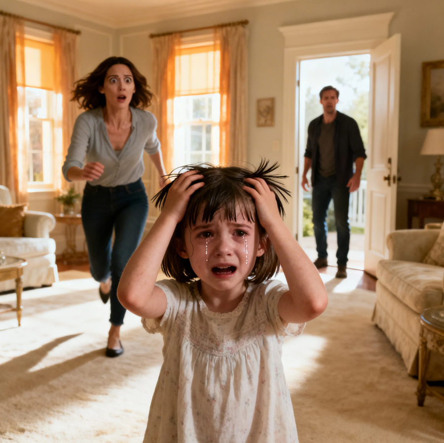 His eyes found mine for a split second wide, alarmed, a father’s instinct firing on all cylinders. We reached the living room doorway at the same time. Ruby stood in the center of the creamcoled carpet, both hands clutching at her head, her small body trembling like a leaf in a hurricane. Her mouth was open in another scream, but this one caught in her throat, emerging as a broken sob that shattered something inside my chest.