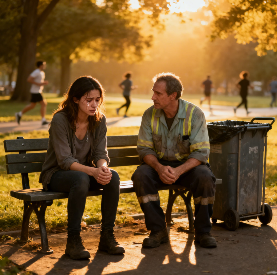 Emily stayed on the bench, holding the paper in her hand. She didn’t cry anymore. She just sat quietly breathing like something inside her had shifted. I couldn’t stop thinking about it. I wanted to know what he had said. What could a man emptying trash possibly tell her that made such a difference? As I got up to leave, I noticed she stood too.
