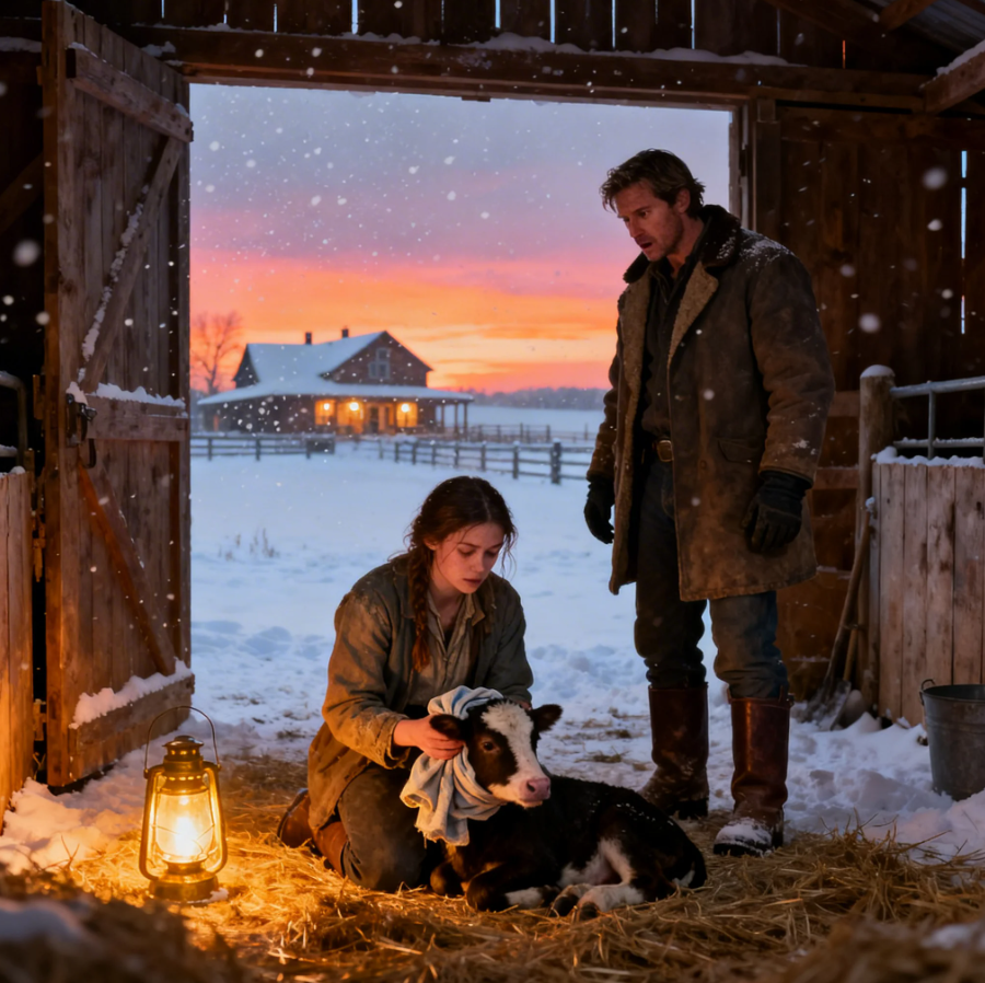 ” They walked in silence through deepening snow. Emma’s boots weren’t made for this weather, and cold seeped through the worn leather. But she kept pace, clutching her bag against her chest. The barn doors swung open. Lantern light spilled across straw and shadows. In the corner, wrapped in blankets, lay a tiny calf.