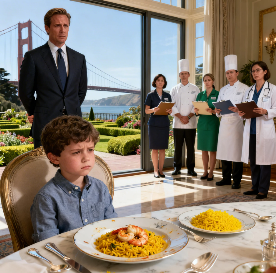 The boy looked at the vibrant yellow rice, pushed it slightly with the tip of his silver fork, and turned his face toward the window. Caleb Montgomery stood with his hands tightly clenched behind his back, staring out at the perfectly manicured gardens that overlooked the Golden Gate Bridge.