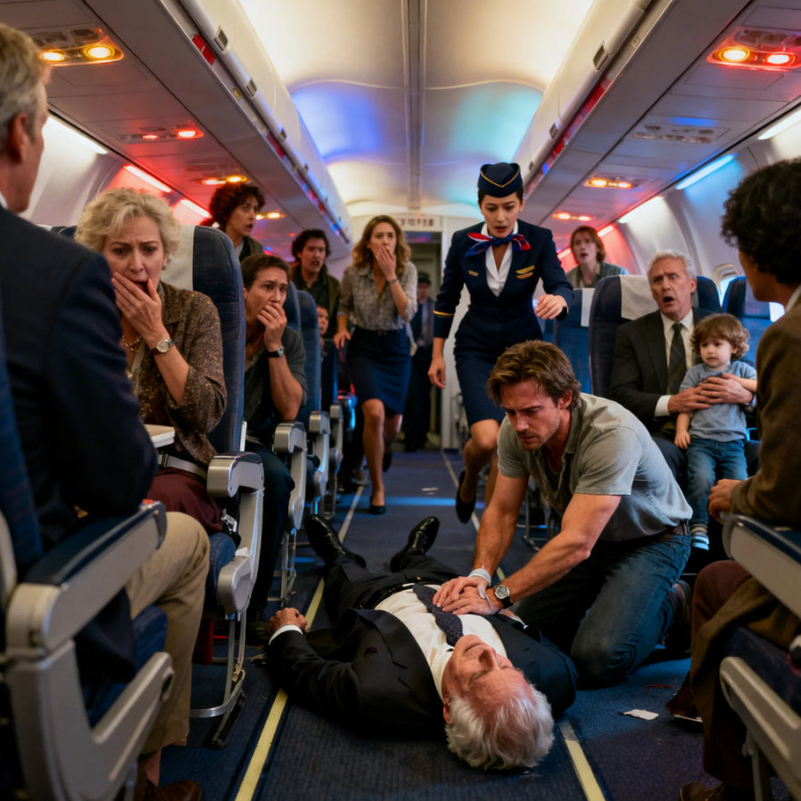 The overhead lights flickered as Marcus Chen pressed his trembling fingers against the stranger’s neck, searching desperately for a pulse he prayed was still there. Around him, passengers screamed and flight attendants rushed down the aisle, but all he could hear was the hammering of his own heart, and the shallow rattling breaths of the elderly man collapsed at his feet.