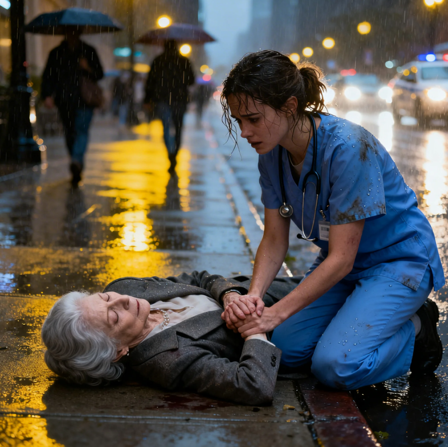 Please, someone help her. She’s not breathing right. Sloan Mercer dropped to her knees on the rain sllicked sidewalk, her worn nursing scrub soaking through instantly. The elderly woman lying before her was pale, her breathing shallow and erratic. Around them, evening commuters rushed past, umbrellas tilted against the drizzle, eyes averted. No one stopped.