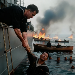 Dos torpedos podrían hundir a ambos destructores. Pérdida total. 600 más Marineros americanos. Y Hartman tenía cuatro más torpedos. 256 horas. El momento de decisión. Hartman no apartó la mirada de el periscopio. lo que vio. americano marineros tirando de sus camaradas en llamas del agua con cuerdas, con botes, algunos arriesgan sus propias vidas, saltando al océano de petróleo en llamas para rescatar hombres. Una escena quedó grabada en la memoria de Hartman.