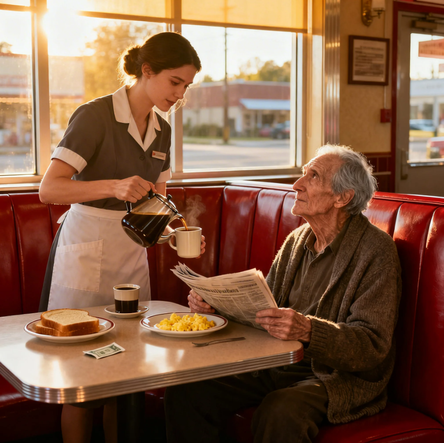“You know what I miss most? Someone remembering how I take my coffee.” The old man’s voice was soft, almost apologetic, as he settled into his usual corner booth at Rosie’s Diner. His hands trembled slightly as he unfolded the newspaper, more ritual than reading these days. 28-year-old Marla Brennan paused mid-stride, coffee pot in hand, and something in his words cracked through her practiced smile.