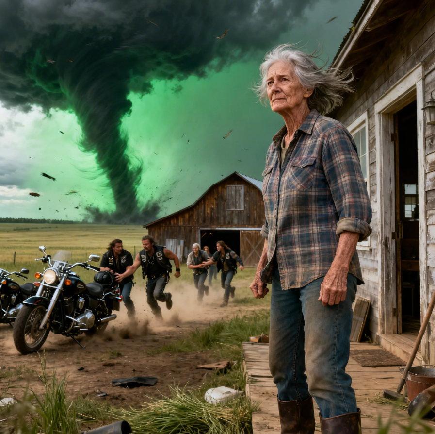There was nothing but flat land and Maggie’s aging farm. No shelter, no overpasses, no trees tall enough to matter. Just wind and sky and the coming monster. The first bike went down at the edge of her gravel driveway, a controlled slide, the rider catching himself with one boot. Two men nearest to him leapt off their own bikes without hesitation to help.