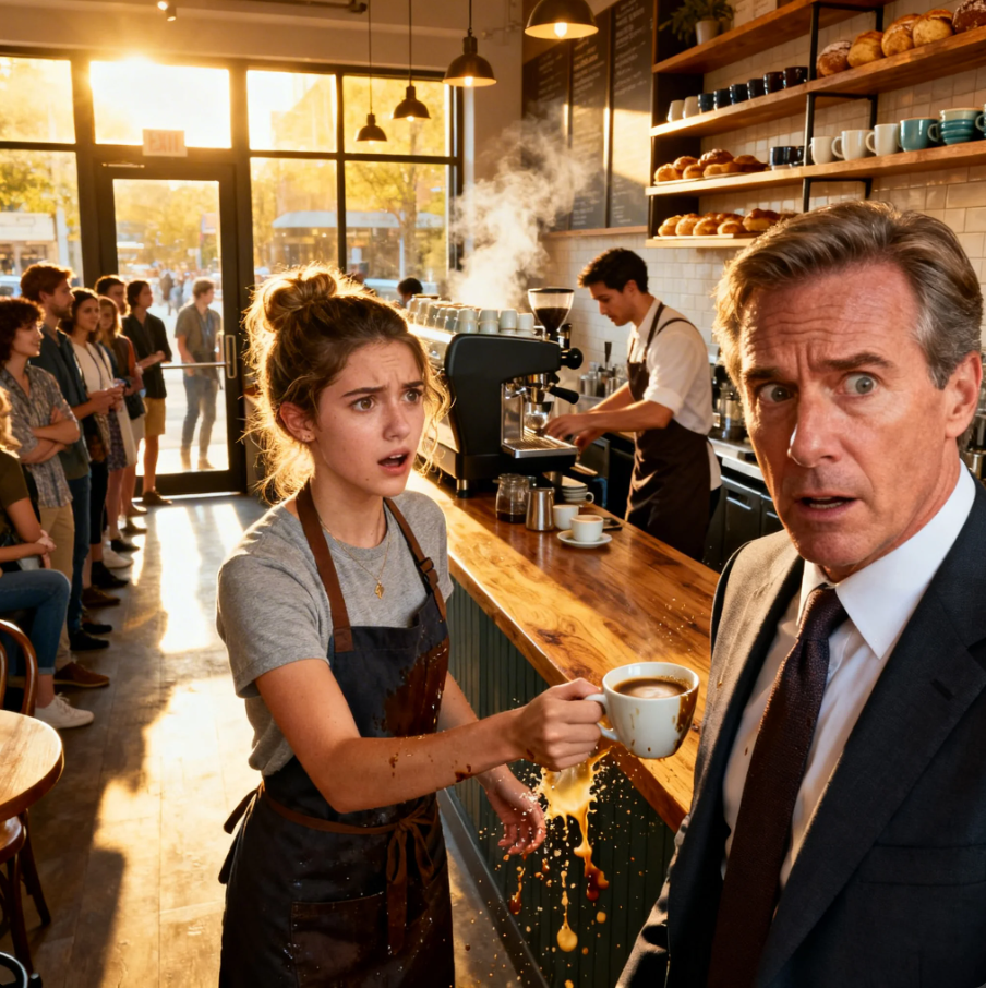 And in one horrifying second, the lid popped off. Hot black coffee spilled forward directly onto the front of the man’s expensive suit. The sound of the cup hitting the floor echoed louder than it should have. Time seemed to freeze. Conversation stopped mid-sentence. The hiss of the espresso machine felt distant.