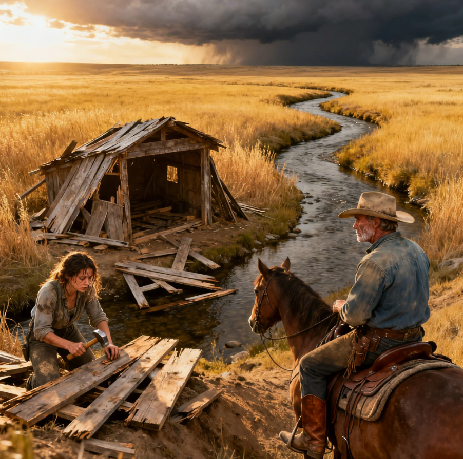“Why? Because that storm’s coming,” Cole said simply. “And you won’t survive it with what you’ve got.” He dismounted slowly, keeping distance, and began unpacking lumber. “Good boards, straight and solid.” Sarah’s throat tightened. She wanted to refuse on principal, but principal didn’t keep you warm when the wind cut through gaps in rotten wood.