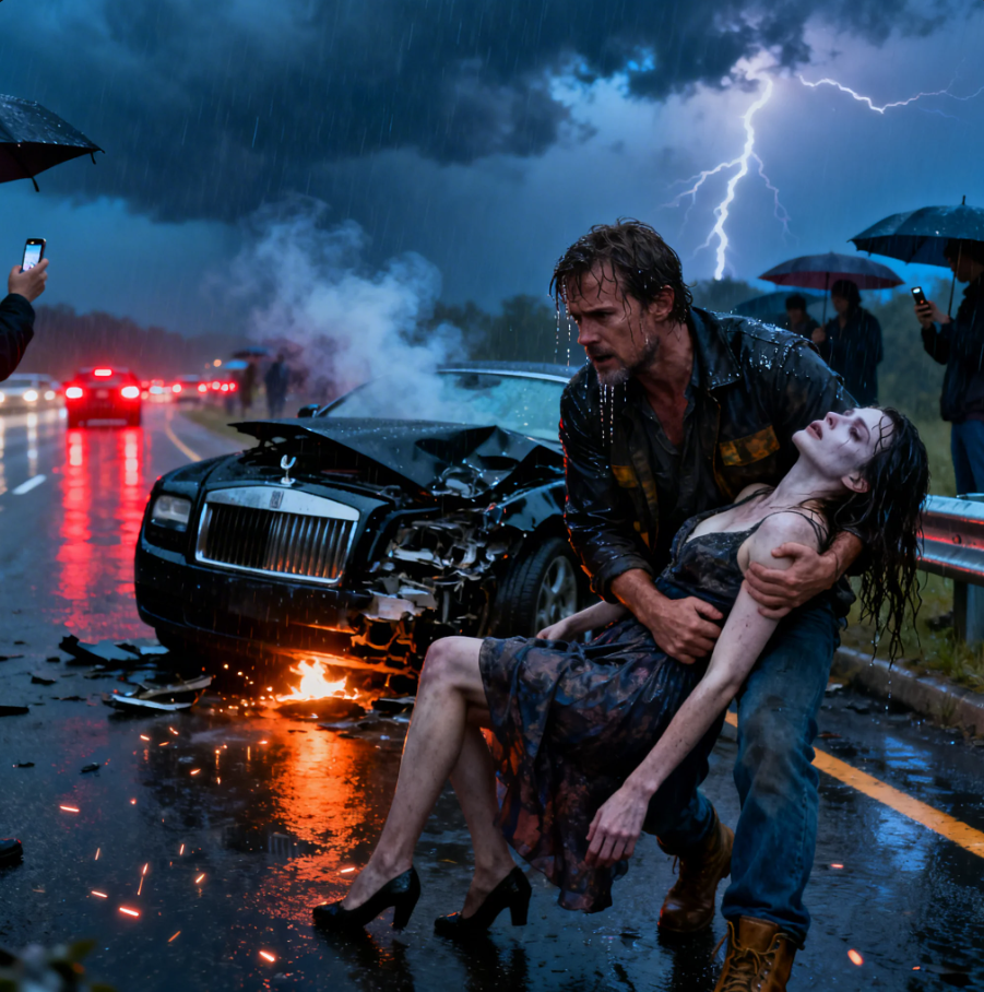 Cars had stopped, forming a hesitant circle around the wreck, but no one stepped forward. Instead, silhouettes stood frozen beneath umbrellas, some holding up phones, recording rather than reacting. Daniel’s heart pounded hard against his ribs as instinct took over. He pulled his old pickup truck onto the shoulder without even turning off the engine and ran toward the wreckage.