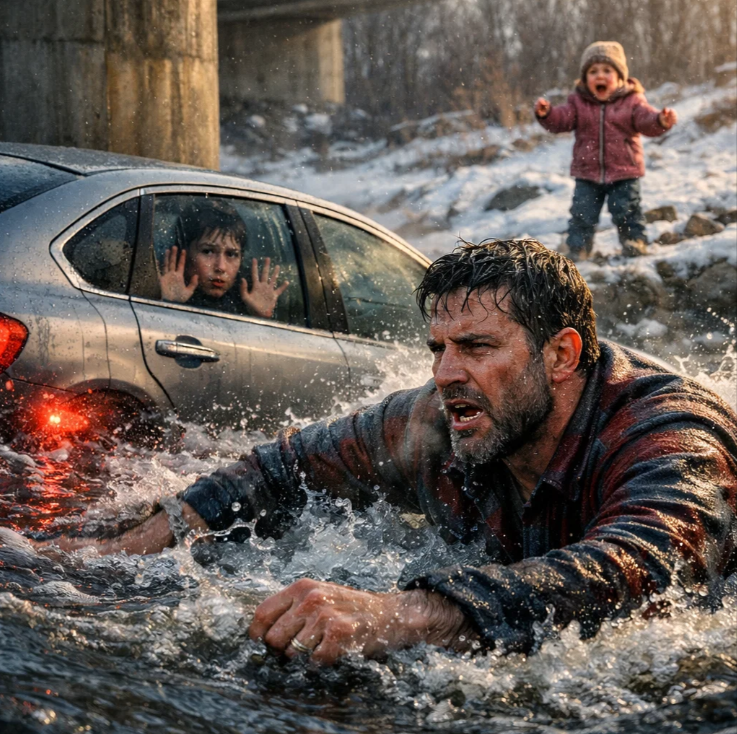 30 yards ahead, pinned against the jagged stone pillar of the old county bridge, a silver sedan was sinking fast. The nose was already fully submerged. The tail lights glowed red beneath the frothing water, casting an eerie, bleeding light into the dark river. “Dad, stop! Come back!” Chloe shrieked, her silhouette, a small, frantic shadow against the gray afternoon sky.