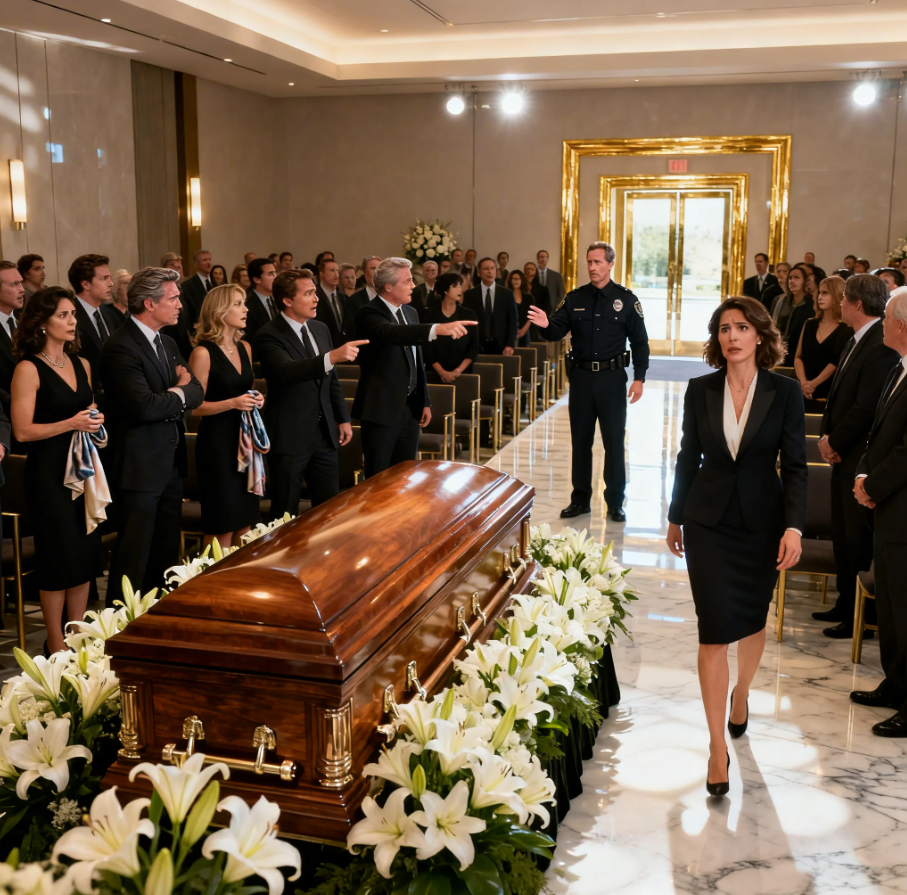 “Excuse me,” a sharply dressed executive snapped from the front row. “Remove him. He’s delusional,” another whispered. “This is a private service.” Three voices, quick and dismissive, trying to bury the moment before it could breathe. But Ethan didn’t move. His eyes were fixed on the casket at the center of the room, surrounded by white lilies and polished marble, where Victoria Hale, billionaire, philanthropist, untouchable icon, was supposed to be at rest.