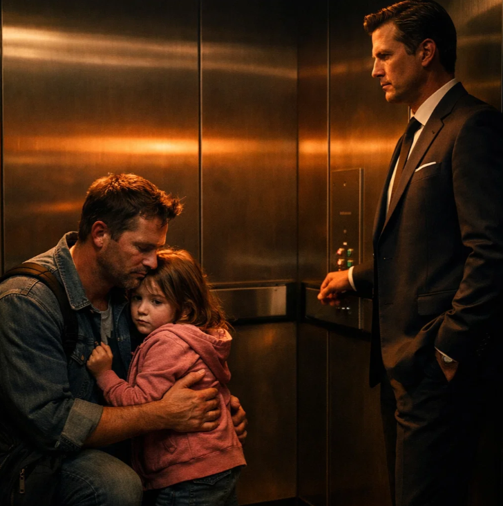 Daniel shifted uncomfortably but didn’t move her. Ethan noticed. You can sit, he said. Daniel shook his head. I’m good. You’ve been standing the whole time. She’s comfortable, Daniel replied simply. Ethan exhaled slowly. Then without a word, he slid down the wall himself, sitting on the floor of the elevator. Expensive suit and all.