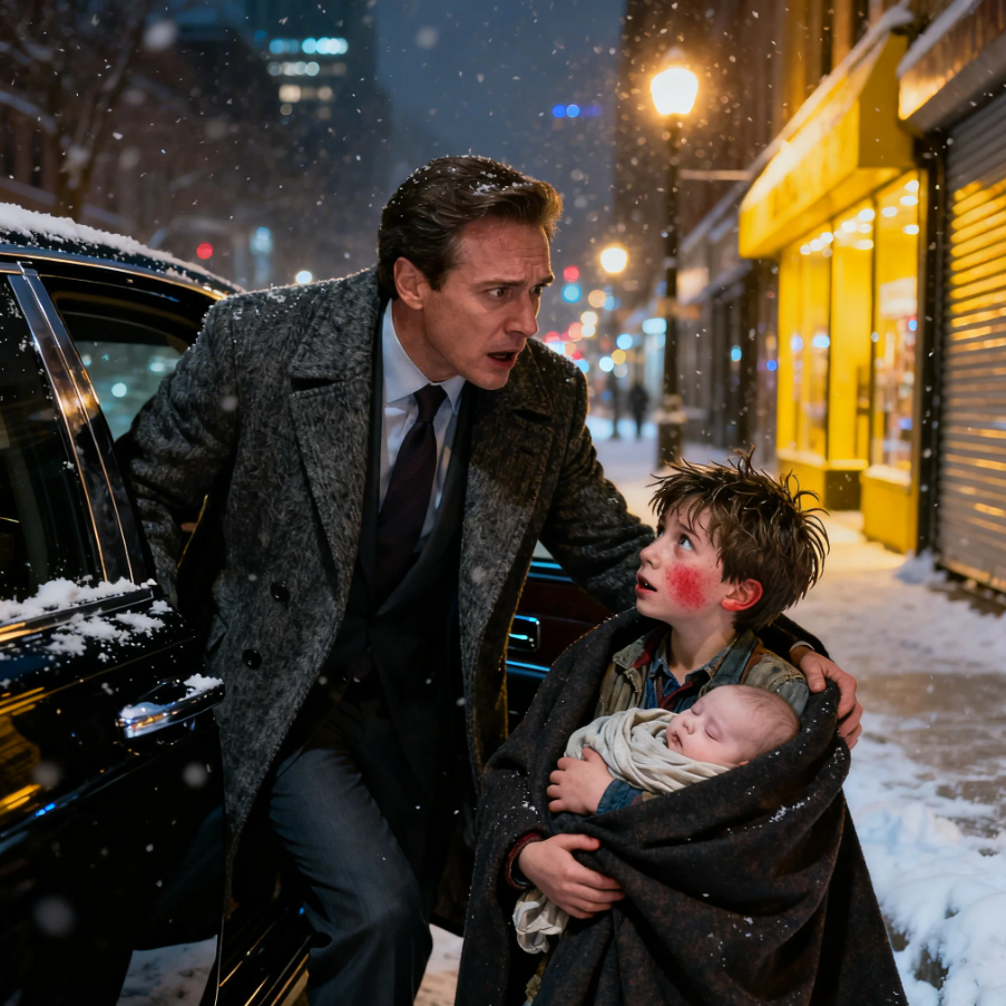 ” The words didn’t sound like a request. They sounded like truth. Adrienne opened the door before his driver could react. The cold bit instantly, sharp and unforgiving, but the boy didn’t move. He stood there, protective, as if stepping back would let the world take what little he had left. Adrienne noticed the baby wrapped in a thin blanket, her tiny face pale, breath shallow but steady.
