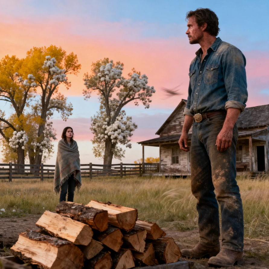 He set another log down and felt the night watching him, as though the land itself wondered what would happen if he truly walked away. That was when he sensed her, not as a sound but as a pause in the wind, a hush that did not belong to the evening. Caleb straightened slowly, fingers stiff with cold and habit, and saw her standing near the fence where the cottonwoods leaned like tired men.