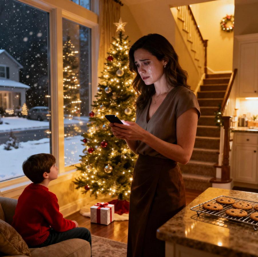 She pressed her palm to her forehead. “Please, not tonight,” she whispered. Before she could gather herself, Aiden walked in holding a small wrapped present. “Mom, should I put Dad’s gift under the tree?” His voice was so soft it nearly broke her. “Yes, sweetheart,” she said. “Put it right in front. He’ll see it when he comes home.