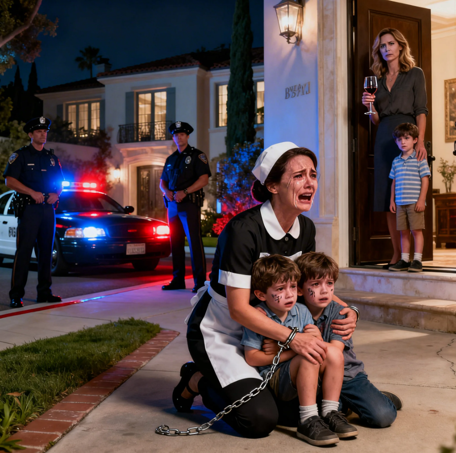 But the moment his feet touched the driveway of his Beverly Hills mansion, he saw something that made his blood run cold. Red and blue lights spinning against the stone facade of his home. A police cruiser parked in front of the gate, engine running, doors open, two uniformed officers standing on the sidewalk, each one holding the arm of a woman that Richard took three full seconds to recognize because he had never seen her like this.