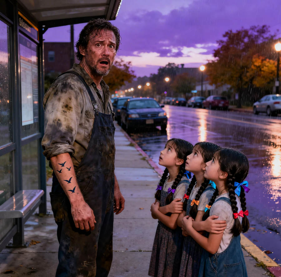 He didn’t have the energy for small talk. He barely had the energy to breathe. Hello, sir. The voice was soft, polite, almost rehearsed. Daniel turned. Three girls stood at the edge of the sidewalk outside the bus stop bench. They couldn’t have been older than eight, identical in a way that made his heart stutter.