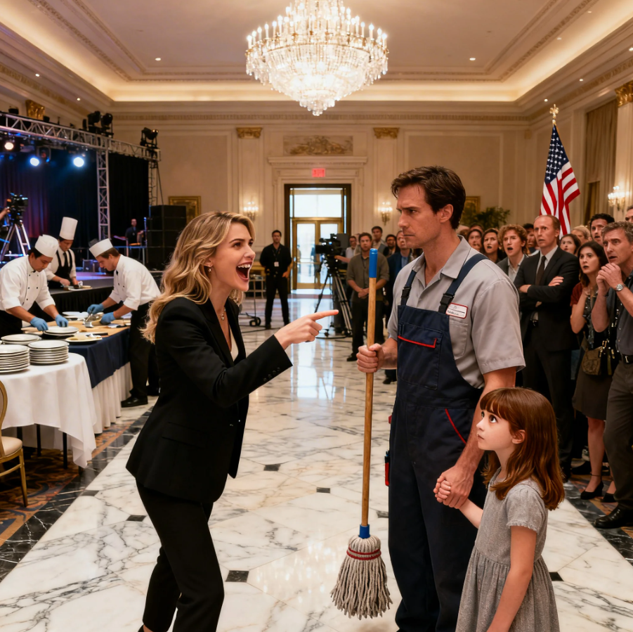 She pointed her finger at him right in front of 500 people and said, “Don’t touch my equipment.” The room froze. He was holding a mop in one hand and his seven-year-old daughter’s hand in the other. She laughed. The crowd laughed. and Ethan Cole just stood there in a cheap janitor’s uniform under the brightest chandelier in New York City saying nothing.