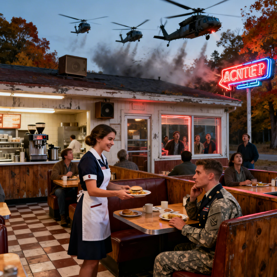 A tall officer stepped out of the first helicopter and walked forward, his posture confident and commanding. He removed his sunglasses and glanced toward the diner building as if searching for something or someone. Then without hesitation, he and two other soldiers began walking straight toward the restaurant entrance. Inside the diner, the atmosphere had completely changed.
