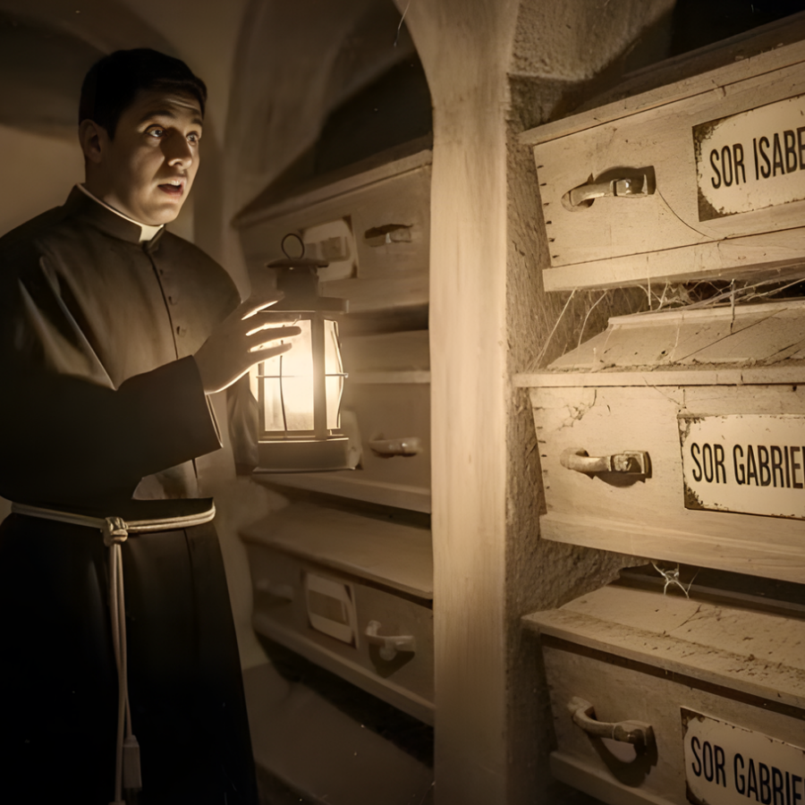 Se giró bruscamente, iluminando con su linterna la figura de la hermana Lucía, quien lo observaba con ojos llenos de terror. “No debería estar aquí, padre”, susurró la joven novicia. “No es seguro para ninguno de los dos.” “¿Qué está pasando aquí, hermana Lucía?”, preguntó Miguel, señalando los ataúdes con manos temblorosas.