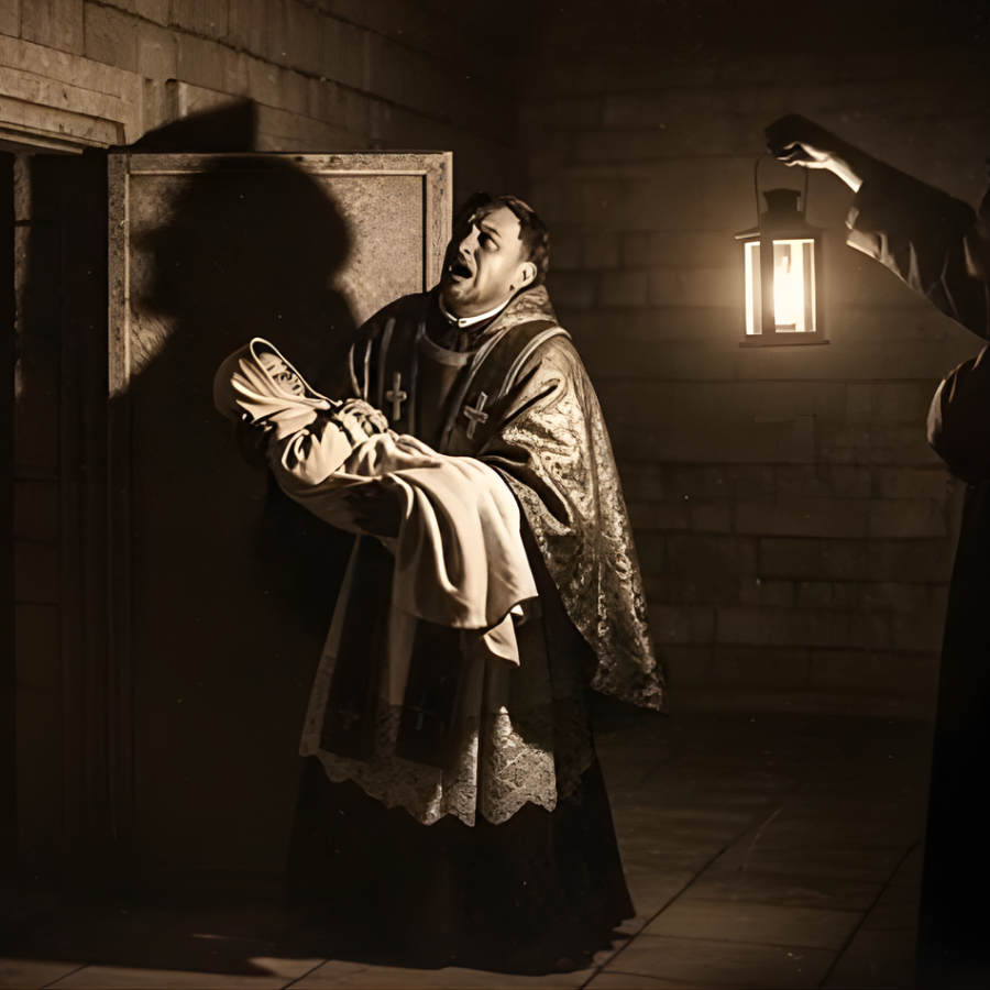 Las imágenes de santos lo observaban desde sus nichos con juicio silencioso. Atravesó el pasillo hasta la sacristía. Detrás de un armario con vestimentas litúrgicas había una puerta pequeña entrada a las criptas. Bajó las escaleras estrechas y resbaladizas, alumbrándose con una vela que proyectaba sombras danzantes sobre paredes cubiertas de musgo.