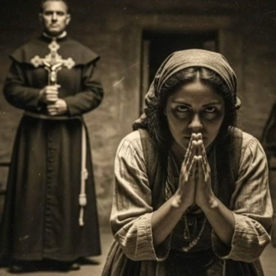 Teresa comenzó a recitar la oración con voz temblorosa. Cuando terminó, el padre Damián se situó detrás de ella. “Otra vez”, dijo, “pero esta vez con verdadera devoción.” Mientras Teresa repetía las palabras sagradas, sintió las manos del sacerdote sobre sus hombros, descendiendo lentamente por su espalda.