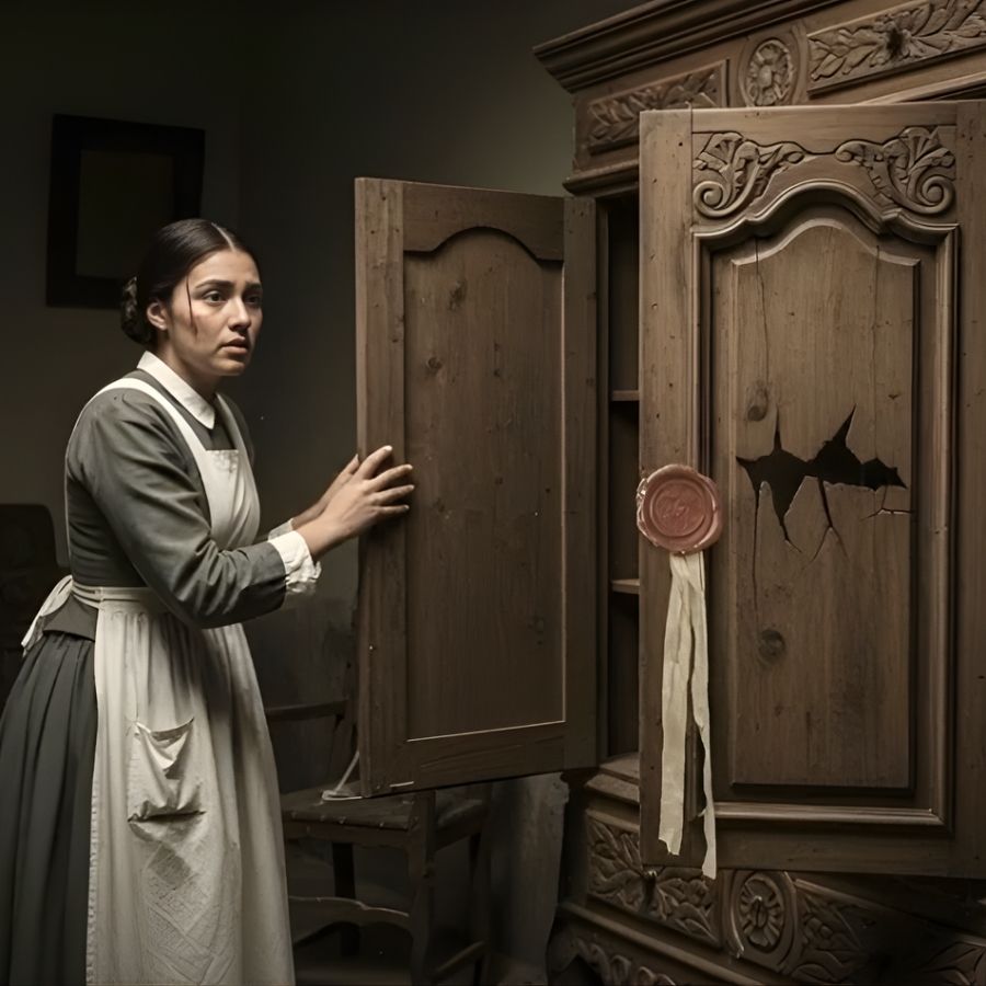 Por un momento, Dolores se quedó inmóvil, temiendo que alguien hubiera escuchado, pero la casa permanecía en silencio. Con manos temblorosas, agarró las manijas de bronce del armario. Estaban frías, tan frías que casi quemaban sus dedos. Tomó aire y tiró de ellas. Las puertas se abrieron con un chirrido prolongado, revelando el interior oscuro del mueble.