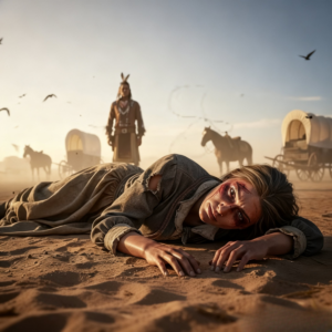 Dejada por muerta por los colonos, fue encontrada por una exploradorache que la reclamó como su esposa. El sol del mediodía abrazaba el desierto, convirtiendo cada piedra en un hierro candente y cada respiración en un jadeo. El calor ondulaba sobre la tierra seca en ondas que distorsionaban el horizonte. Tres carretas se inclinaban sobre ruedas rotas con el polvo arremolinándose en el aire como manos fantasmales.
