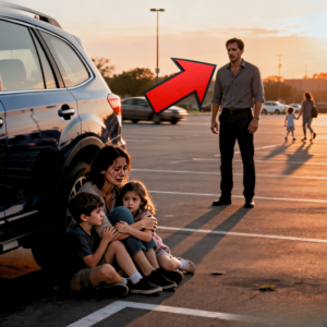 Salió al aire cálido de la tarde, el cielo pintado de tonos dorados y naranjas suaves. Los coches pasaban por el borde del aparcamiento, familias volviendo a casa después de cenas o recados de fin de semana, pero una escena lo detuvo en seco. Al fondo del aparcamiento, sentada contra un todoterreno azul marino, había una mujer con las rodillas encogidas, los hombros acudiéndose en soyosos silenciosos y desesperados.
