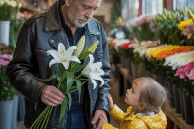 Un motociclista viudo que compraba lirios para su difunta esposa se quedó paralizado, hasta que una vocecita con un impermeable…