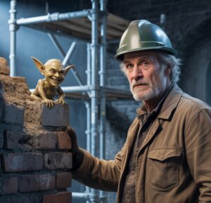 Una pequeña figura verdosa, de orejas puntiagudas, trabajaba con destreza sobrehumana, pegando ladrillos con rapidez y prec