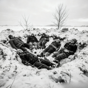 Su cuerpo estaba rígido como una estatua de hielo, su piel grisa cubierta de cristales, sus ojos abiertos en una expresión de sorpresa eterna. No había sangre, no había heridas de bala, solo el invierno, ese titán silencioso que no distingue entre soldado y civil, entre invasor y defensor. La gangrena por congelación se extendió como una plaga bíblica.