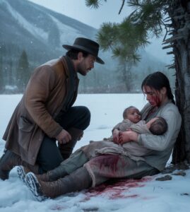 Cerca del arroyo de Miller, un sonido extraño lo obligó a detenerse en seco. Entre el crujido suave de la nieve reconoció el llanto de un bebé, acompañado de una voz femenina que murmuraba consuelo. Intrigado, desmontó con cautela y se adentró hacia un pequeño grupo de árboles que ofrecían algo de refugio contra el viento.